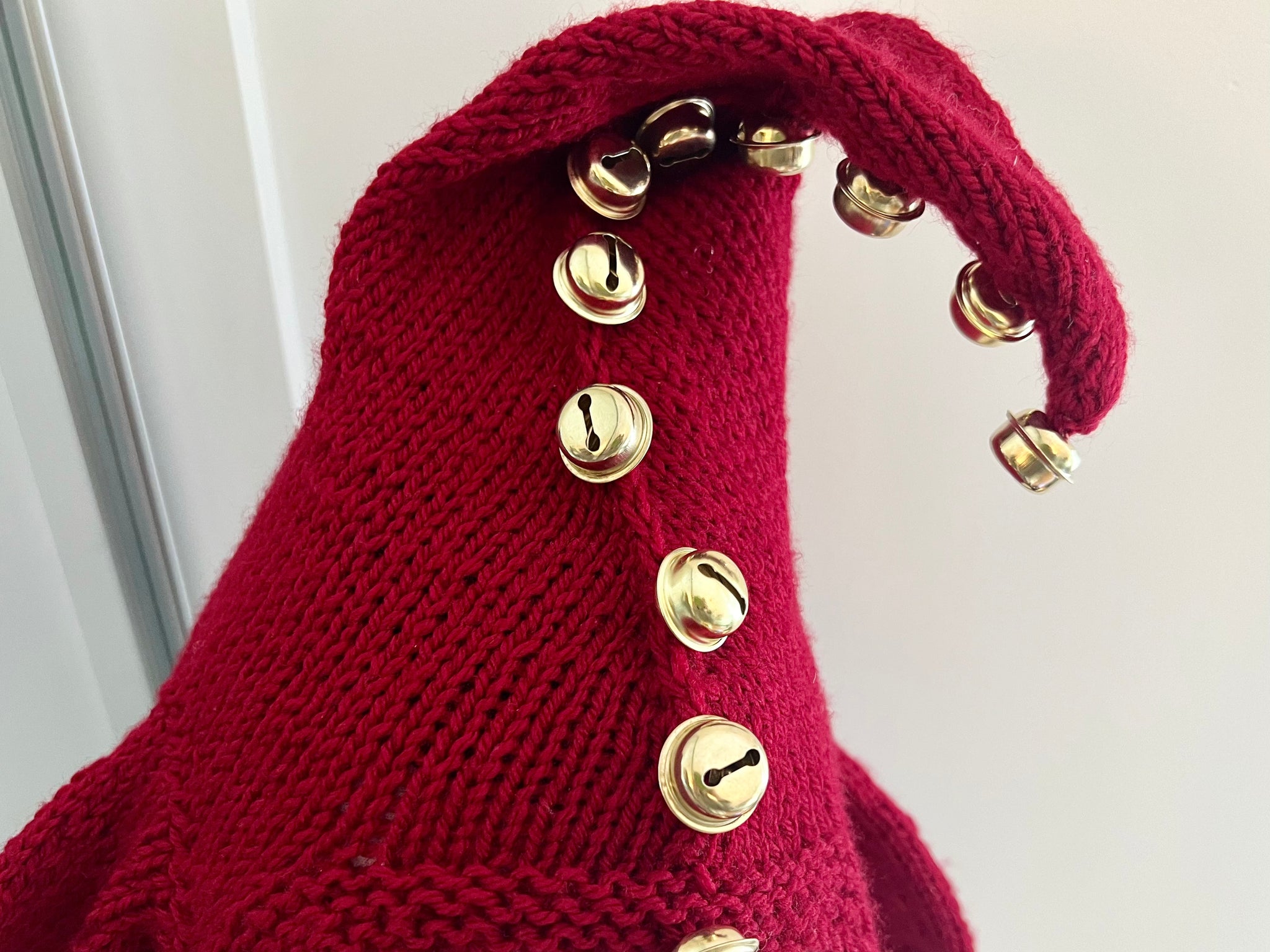 Yarn material: dark red acrylic with gold bells. Contains wire and felt within to keep the middle upright and bouncy